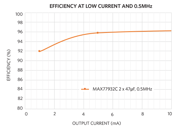 該 IC 在低電流下也具有出色的效率。圖 7 顯示,電流在 1mA 至 10mA 范圍內(nèi)時(shí),效率超過 92%。由于便攜式設(shè)備長時(shí)間處于待機(jī)狀態(tài),此功能可顯著延長電池壽命。