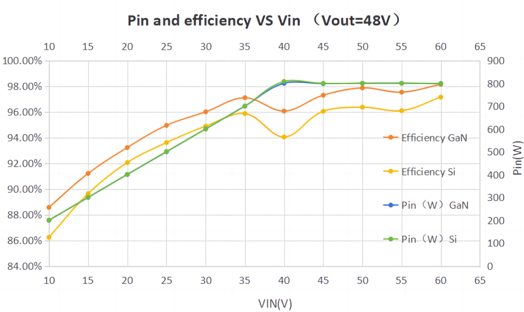 圖6.  Vin=10~60V,Vout=48V條件滿電流Si和GaN效率對比