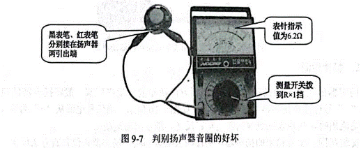 判斷揚(yáng)聲器的好壞,可用萬用表電阻擋進(jìn)行檢測。檢測時(shí),把揚(yáng)聲器口朝下平放在桌面上,萬用表置于R×1擋,兩表筆(不分正、負(fù))斷續(xù)觸碰揚(yáng)聲器或耳機(jī)的兩引出端,如圖9—7所示。揚(yáng)聲器或耳機(jī)中應(yīng)發(fā)出“咯、咯···”聲,聲響越大表明揚(yáng)聲器靈敏度越高;如果發(fā)聲很小,且萬用表表針擺動幅度也小,則表明性能較差,可能是音圈局部短路(感應(yīng)電勢下降);如果揚(yáng)聲器無聲,且萬用表表針不擺動,則可能是引出線斷線或音圈燒斷;若揚(yáng)聲器無聲,但萬用表表針擺動,則表明音圈引出線是好的,但音圈被卡住而不動。