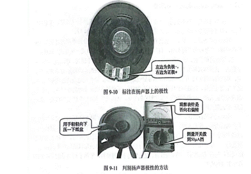 安裝在同一個(gè)音箱中的揚(yáng)聲器,所接極性必須相同。揚(yáng)聲器相位判斷方法如下:揚(yáng)聲器口朝上放置,萬用表置于“直流50uA”擋,兩表筆分別接揚(yáng)聲器兩引出端,用手輕輕向下壓一下紙盆。在向下壓的瞬間,如果表針向右偏轉(zhuǎn),則黑表筆所接為揚(yáng)聲器的“+”端,紅表筆所接為揚(yáng)聲器的“—”端,如圖9—11所示。