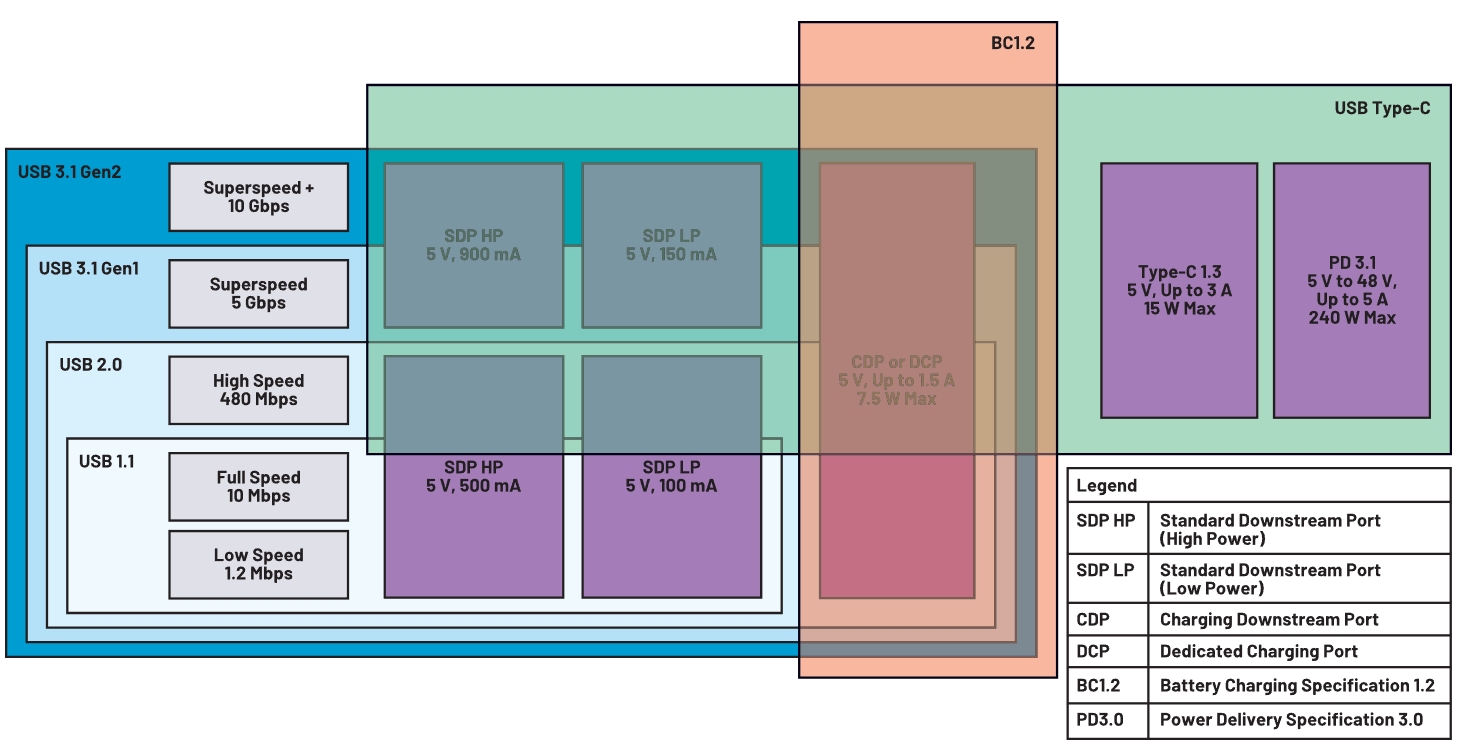 隨著時(shí)間推移,消費(fèi)者開(kāi)始要求USB提供更多功能。他們想通過(guò)USB電纜快速給電池充電,此時(shí)500 mA最大電流已經(jīng)無(wú)法滿足要求。BC1.2標(biāo)準(zhǔn)允許通過(guò)USB電纜傳輸高達(dá)7.5 W功率——5 V電壓和1.5 A電流,該標(biāo)準(zhǔn)滿足了這些消費(fèi)者的需求。BC1.2標(biāo)準(zhǔn)擴(kuò)展了通過(guò)USB電纜為電池充電的能力,在BC1.2標(biāo)準(zhǔn)之后,每一項(xiàng)新標(biāo)準(zhǔn)都在之前的基礎(chǔ)上增加了功率容量。Type-C 1.3將功率容量擴(kuò)展到15 W(最大值),而USB PD 3.0使系統(tǒng)功率升級(jí)達(dá)到100 W(最大值)。其最新的規(guī)格更新USB PD3.1將功率容量進(jìn)一步擴(kuò)展到了240 W(最大值)。