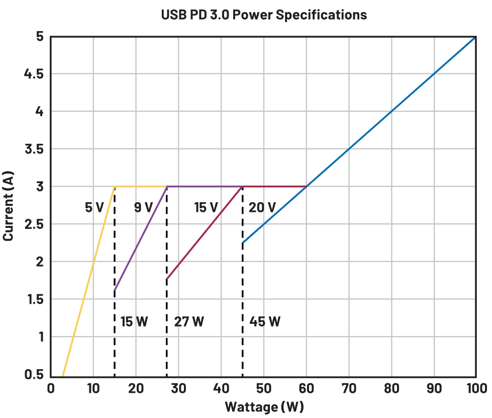 BC1.2和Type-C 1.3繼續(xù)提供以前在所有USB標(biāo)準(zhǔn)中使用的5 V供電軌,但通過(guò)將最大電流增加到1.5 A和3 A,將功率容量分別增加到7.5 W和15 W。USB PD3.0同樣提高了電流和電壓容量,使功率容量達(dá)到100 W(最大值)。它允許兩個(gè)設(shè)備通過(guò)USB電纜傳輸高達(dá)20 V電壓和5 A電流。新PD3.1規(guī)格支持高達(dá)48 V電壓和5 A電流。