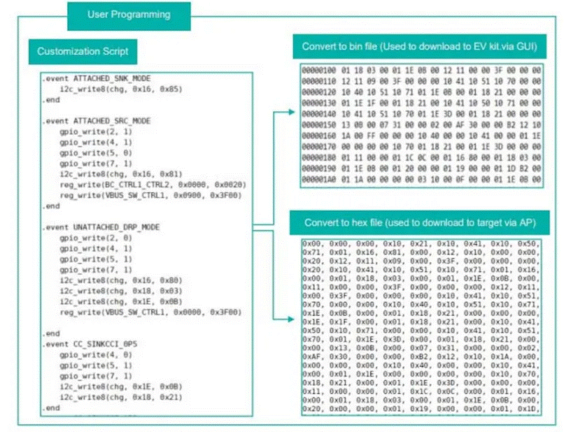 設(shè)計(jì)人員可以使用圖形用戶界面(GUI)為典型應(yīng)用生成定制腳本,然后將其加載到IC的非易失性存儲(chǔ)器中。PD控制器自動(dòng)執(zhí)行命令,例如切換GPIO,或通過(guò)I2C主端口向充電器發(fā)送I2C命令等。