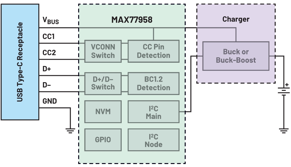 獨(dú)立PD控制器的一個(gè)示例是 MAX77958 (圖5)。MAX77958具有兩個(gè)獨(dú)特功能:非易失性存儲(chǔ)器和直接控制配套充電器的I2C主端口。這兩個(gè)功能消除了對(duì)外部MCU的需求,也無(wú)需開(kāi)發(fā)定制固件。