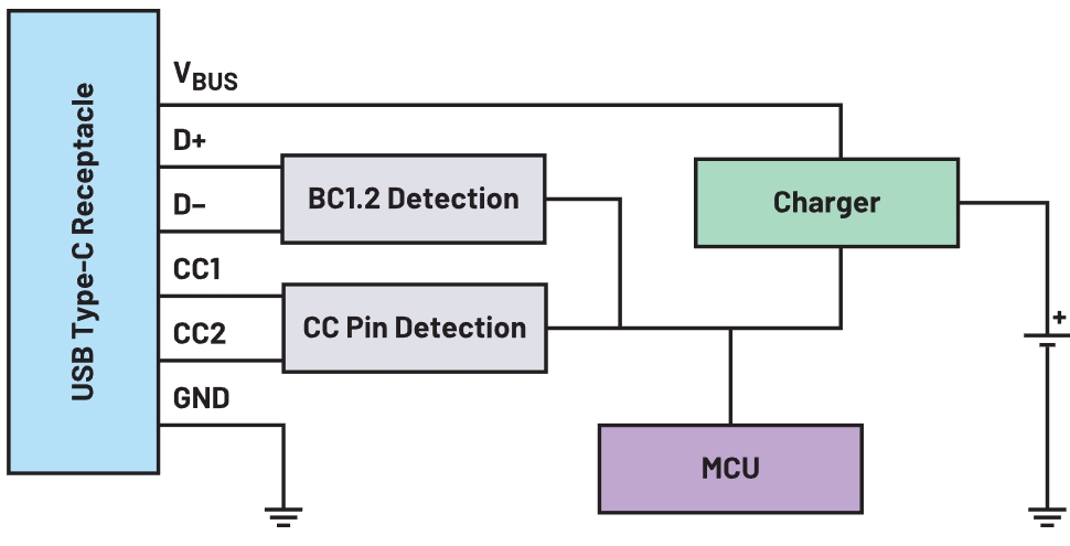 BC1.2檢測(cè)IC支持傳統(tǒng)的USB適配器。雖然更新的設(shè)備更廣泛地采用USB Type-C,但許多應(yīng)用仍然使用舊的USB規(guī)格。BC1.2兼容端口采用D+/D-引腳來(lái)傳輸電源的功率容量,而不是CC引腳。BC1.2檢測(cè)IC讀取D+/D-引腳,為仍然使用傳統(tǒng)USB標(biāo)準(zhǔn)的應(yīng)用配置充電。