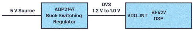 另一個(gè)DVS使用示例如圖2所示。在此示例中,ADP2147 降壓型開關(guān)穩(wěn)壓器為數(shù)字信號處理器(DSP)供電。在許多應(yīng)用中,都可以使用微控制器、DSP或FPGA來提高系統(tǒng)效率,方法是:在處理器處于待機(jī)模式時(shí)降低內(nèi)核電壓。在VDD_INT電壓(內(nèi)核電壓)降低(例如,在DSP在低負(fù)載狀態(tài)下運(yùn)行時(shí),從1.2 V降低至1.0 V)時(shí),多種DSP,包括ADI提供的ADSP-BF527 都可以更高效地運(yùn)行。處理器的功耗在很大程度上與其時(shí)鐘頻率和工作電壓的平方成比例。將ADSP-BF527的電源電壓降低25%,動(dòng)態(tài)功耗會(huì)降低超過40%。ADI的許多DSP都具有類似特性。