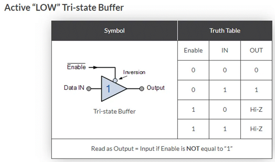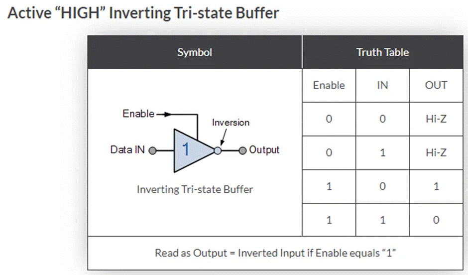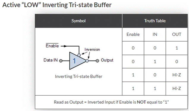 共四種不同類型的三態(tài)緩沖器,一組是通過“高電平有效”控制信號啟用或禁用輸出,從而產(chǎn)生逆向或非逆向輸出,另一組是通過“低電平有效”控制信號來控制緩沖器輸出,從而產(chǎn)生逆向或非逆向輸出,如下所示。