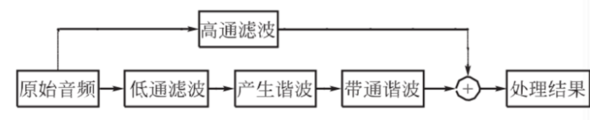 心理聲學實驗中,存在一種“虛擬音調(diào)”的實驗現(xiàn)象:人耳在基頻缺失的情況下利用諧波組合重建信號音調(diào)高低。主要流程如下圖,產(chǎn)生諧波主要方法為MaxxBass算法和VB Phase Vocoder。