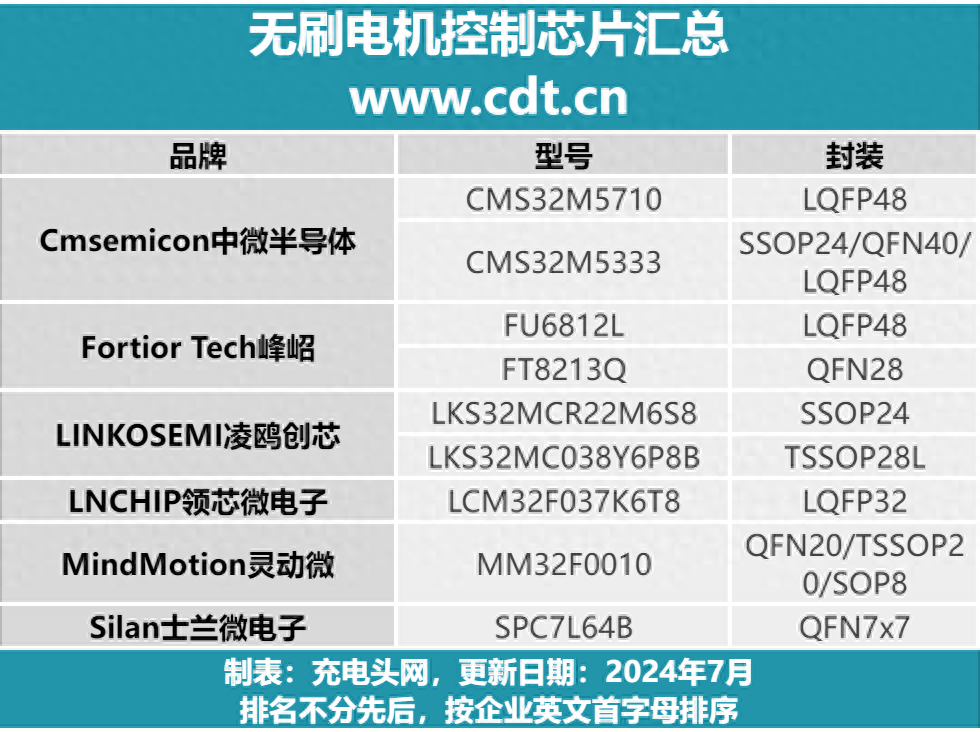 充電頭網(wǎng)從過(guò)往的拆解案例與新聞中匯總出目前市面上常見(jiàn)的無(wú)刷電機(jī)控制芯片,具體如下表所示。