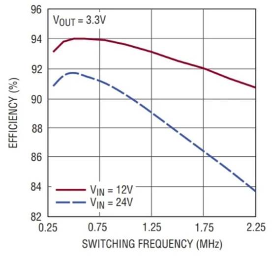 降壓開關(guān)穩(wěn)壓器的效率與頻率的關(guān)系圖。該圖取自Linear Tech/Analog Devices的 LT8610 數(shù)據(jù)表。
