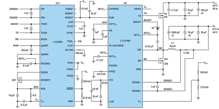 圖2. LT8551電源部分U1.2和U1.3的電路原理圖。LT8551連接至主升壓控制器的接口如圖1所示。VIN = 6 V 至 46 V, VOUT = 48 V (30 A時(shí))。