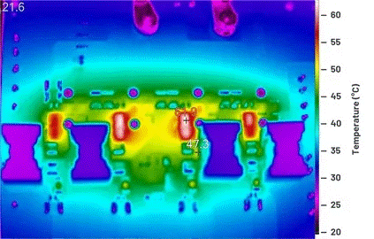 圖6. 在對(duì)流冷卻(無(wú)空氣流動(dòng))情況下,基于LT8551的演示電路的熱影像。25 A時(shí), VIN = 24 V, VOUT = 48 V 。