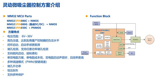 在吸塵器方案中,靈動(dòng)的SPIN080C/G芯片內(nèi)部集成LDO,預(yù)驅(qū)以及DC/DC;芯片內(nèi)部集成的DC/DC最高支持100V電壓。同時(shí)靈動(dòng)的SPIN030C可以滿足低壓小功率的吸塵器應(yīng)用需求。