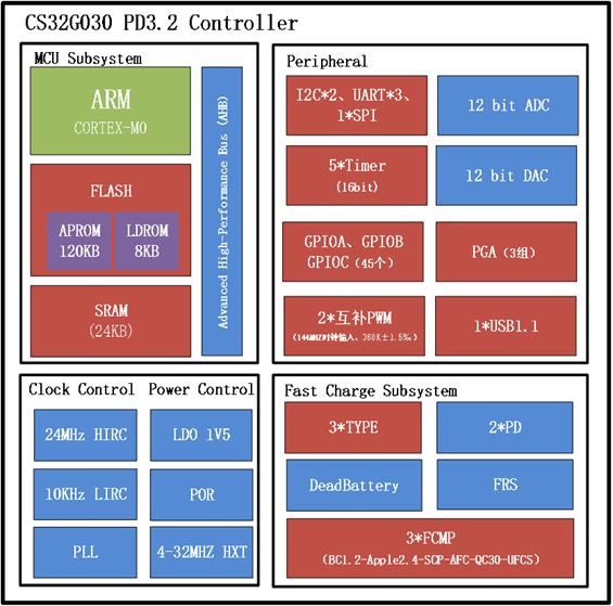 然而,自2018年發(fā)布至今,隨著快充技術(shù)的不斷演進(jìn)和市場(chǎng)需求的變化,CS32G020在充電功率、放電采樣、多協(xié)議兼容性、PWM精度及特定功能支持等方面逐漸顯現(xiàn)出一些不足,同時(shí)對(duì)芯片的性能和資源提出了更高要求。為了應(yīng)對(duì)這些挑戰(zhàn),芯?萍荚谏钊胝{(diào)研PD眾多應(yīng)用場(chǎng)景之后,對(duì)CS32G020進(jìn)行了全面升級(jí),推出了全新PD3.2&UFCS控制器:CS32G030。