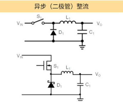 如圖所示,在非隔離型開關(guān)電源類型中,非同步整流型開關(guān)電源是指高邊開關(guān)使用MOSFET,而低邊續(xù)流回路使用二極管(左圖中的D1)的電路拓?fù)洌ㄖ挥幸粋(gè)開關(guān)管)。
