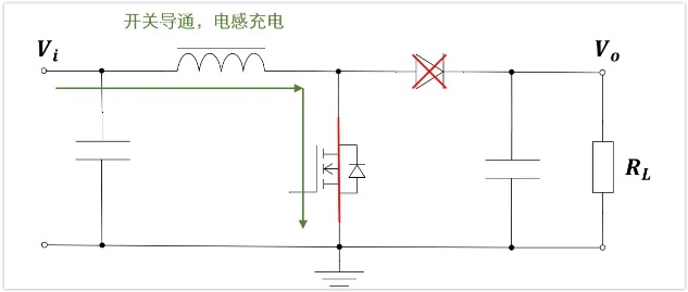 在開(kāi)關(guān)導(dǎo)通時(shí),電感L接地,二極管截止,輸入電壓Vi對(duì)電感L進(jìn)行充電,電感兩端電壓是Vi。