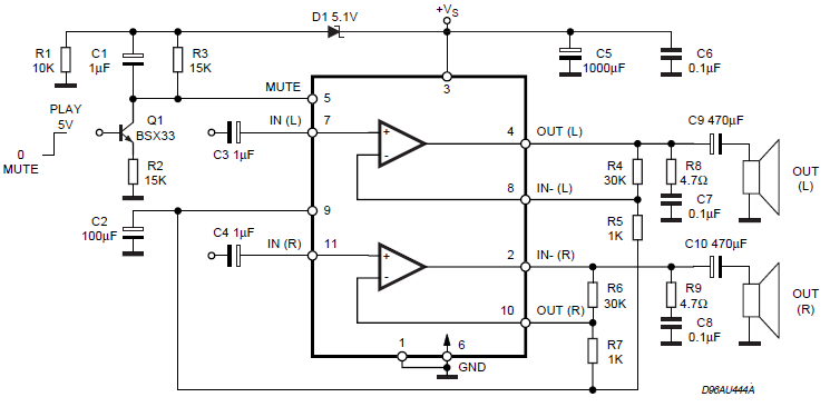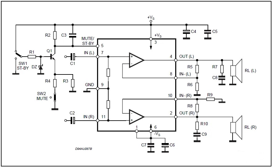 備注:圖中揚(yáng)聲器端并聯(lián)的RC串聯(lián)網(wǎng)絡(luò)是為了防止震蕩