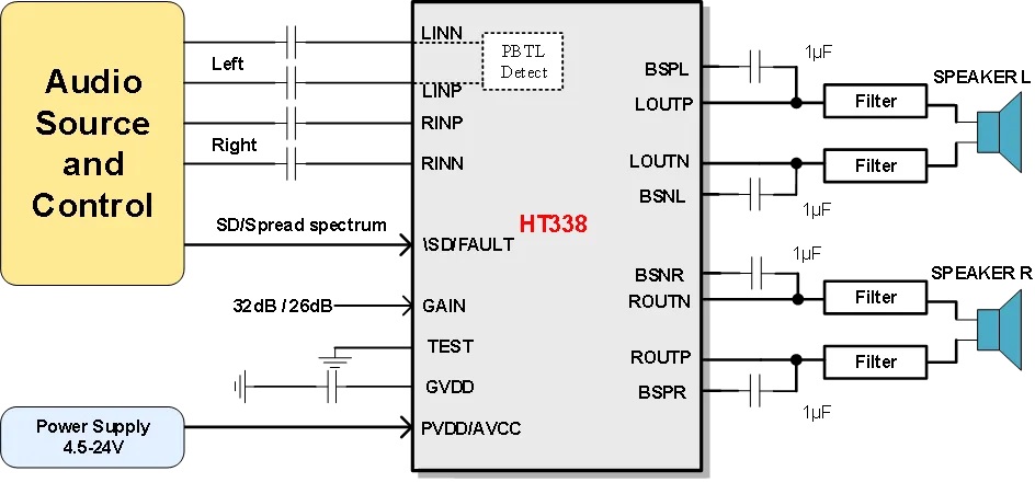 2x50W(VDD=24V, RL=6Ω, THD+N=10%)(HT338)