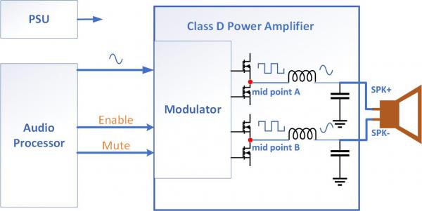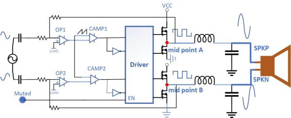 Class D功率放大器輸出與輸入音頻信號(hào)相對(duì)應(yīng)的脈沖,A點(diǎn)和B點(diǎn)的脈沖由半橋開關(guān)產(chǎn)生。低通濾波器由電感和電容組成,為從這些高頻脈沖中解調(diào)出的音頻信號(hào)提供路徑,解調(diào)后的音頻信號(hào)通過揚(yáng)聲器,將電能轉(zhuǎn)換為聲能,然后被人的耳朵聽到。如果用戶在開始播放音樂或計(jì)劃停止音樂時(shí)總是聽到爆裂聲或點(diǎn)擊聲,這將是非常糟糕的體驗(yàn)。
