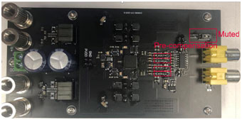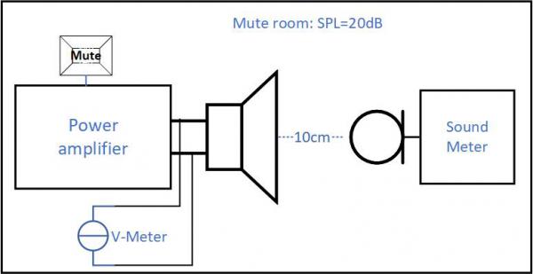 Figure 7 該平臺(tái)用于爆裂噪聲評(píng)估,V-Meter可以測(cè)量直流偏置電壓,Sound meter可以測(cè)量來自揚(yáng)聲器的爆裂噪聲的聲壓。靜音按鈕用于將功率放大器從靜音切換到取消靜音或從取消靜音切換到靜音,Sound meter的麥克風(fēng)傳感器與揚(yáng)聲器在同一條線上,Sound meter將測(cè)量揚(yáng)聲器的聲壓級(jí)。該平臺(tái)設(shè)置在靜音室中,然后分別進(jìn)行有預(yù)補(bǔ)償和無預(yù)補(bǔ)償?shù)臏y(cè)試,數(shù)據(jù)列在以下表格中。