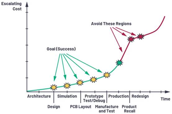 設(shè)計(jì)從圖紙上看起來(lái)可能毫無(wú)問(wèn)題(也就是說(shuō),從原理圖角度),甚至在模擬期間也沒(méi)有任何問(wèn)題,但真正的測(cè)試其實(shí)是在布局、PCB制造,以及通過(guò)載入電路實(shí)施原型制作應(yīng)力測(cè)試之后。這部分使用真實(shí)的設(shè)計(jì)示例,介紹一些技巧來(lái)幫助避開陷阱。我們將介紹幾個(gè)重要概念,以幫助避開設(shè)計(jì)缺陷和其他陷阱,以免未來(lái)需要重新設(shè)計(jì)和/或重新制作PCB。圖1顯示在沒(méi)有進(jìn)行細(xì)致測(cè)試和余量分析的情況下,在設(shè)計(jì)進(jìn)入生產(chǎn)之后會(huì)如何造成成本急速上漲。