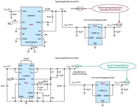 退出級(jí)聯(lián)階段時(shí),要避免限流情況。圖2所示為一個(gè)典型的級(jí)聯(lián)應(yīng)用:(A) 顯示由產(chǎn)生3.3 V電源,電流最大500 mA的ADP5304 降壓穩(wěn)壓器(PSU1)構(gòu)成的設(shè)計(jì)。為了提高效率,設(shè)計(jì)人員應(yīng)分接3.3 V電軌,而不是5 V輸入電源。3.3 V輸出被進(jìn)一步切斷,以為PSU2 (LT1965)供電,這款LDO穩(wěn)壓器用于進(jìn)一步將電壓降低至2.5 V,且按照板載2.5 V電路和IC的要求,將最大輸出電流限制在1.1 A。