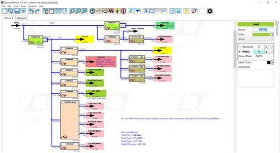 在考慮這一點(diǎn)的情況下,先創(chuàng)建真實(shí)的功率預(yù)算,然后選擇控制器。包括您所需的所有電源電軌:2.5 V、3.3 V、5 V等。包括所有會(huì)消耗每個(gè)電軌功率的上拉電阻、離散器件和IC。使用這些值反向工作,以如圖2b所示,估算您需要的電源。使用電力樹系統(tǒng)設(shè)計(jì)工具,例如LTpowerPlanner(圖3)來(lái)輕松創(chuàng)建支持所需的功率預(yù)算的電力樹。