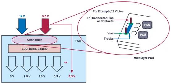 將圖2中所示的示例的總電流擴(kuò)展至17 A,那么設(shè)計(jì)人員必須考慮引腳的電流處理接觸能力,如圖4所示。一般來(lái)說(shuō),引腳或接觸點(diǎn)的載流能力受幾個(gè)因素影響,例如引腳的大。ń佑|面積)、金屬成分等。直徑為1.1 mm的典型過(guò)孔凸式連接引腳的電流約為3 A。如果需要17 A,那么應(yīng)確保您的設(shè)計(jì)具有足夠多的引腳,足以處理總體的載流容量。這可以通過(guò)增大每個(gè)導(dǎo)體(或觸點(diǎn))的載流能力來(lái)輕松實(shí)現(xiàn),并保留一些安全裕度,使其載流能力超過(guò)PCB電路的總電流消耗。在本例中,要實(shí)現(xiàn)17 A需要6個(gè)引腳(且具備1A余量)。V CC 和GND一共需要12個(gè)引腳。要減少觸點(diǎn)個(gè)數(shù),可以考慮使用電源插座或更大的觸點(diǎn)。