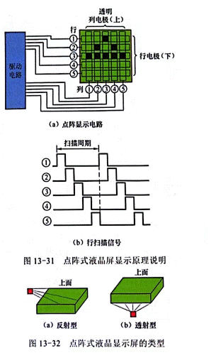 點(diǎn)陣式液晶顯示屏有反射型和透射型之分,如圖13-32所示,反射型LCD屏依靠液晶不透明來反射光線顯示圖形,如電子表顯示屏、數(shù)字萬用表的顯示屏等都是利用液晶不透明(通常為黑色)來顯示數(shù)字,透射型LCD屏依靠光線透過透明的液晶來顯示圖像,如手機(jī)顯示屏、液晶電視顯示屏等都是采用透射方式來顯示圖像的。