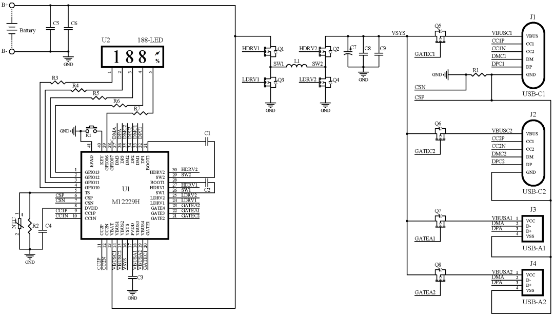 以水芯電子M12229H為例,其為2串單路PD3.0移動(dòng)電源SOC,覆蓋2串電芯 35W移動(dòng)電源的應(yīng)用。其集成了同步升降壓電壓變換器、電池充放電管理模塊、顯示模塊、電量計(jì)算模塊,提供 35W 輸入/輸出功率,支持 PD3.0、QC3.0、AFC、FCP、SCP、BC1.2 DCP 等主流快充協(xié)議,并提供輸入/輸出的過壓/欠壓、電池過壓、過充/過放、NTC 過溫、放電過流、輸出短路保護(hù)等完備的保護(hù)功能。