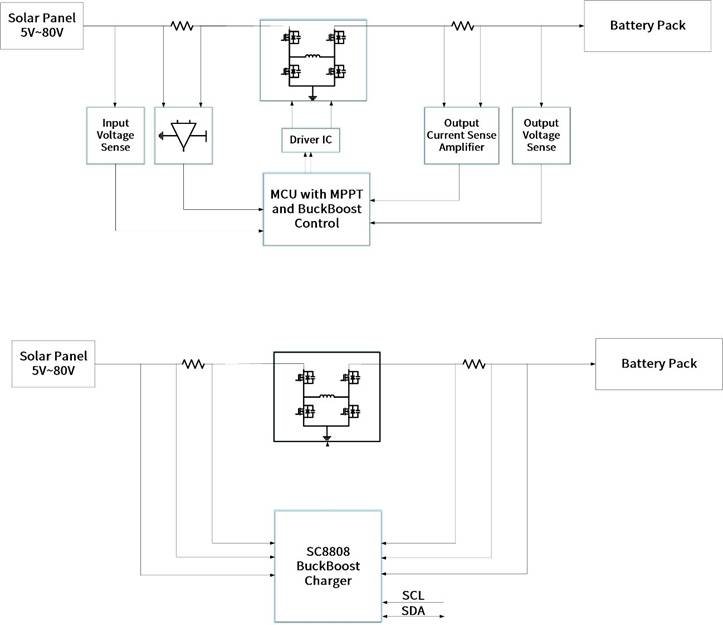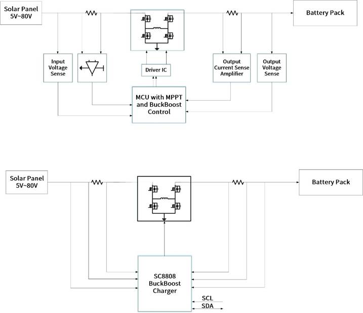 1.集成度高,控制實(shí)現(xiàn)簡單。SC8808 內(nèi)部集成升降壓控制和 MPPT 算法,還集成了 11 位高精度 ADC 用于電壓、電流和 NTC 熱敏電阻檢測電池組溫度檢測,外圍電路簡單,幫助工程師降低系統(tǒng)開發(fā)成本。