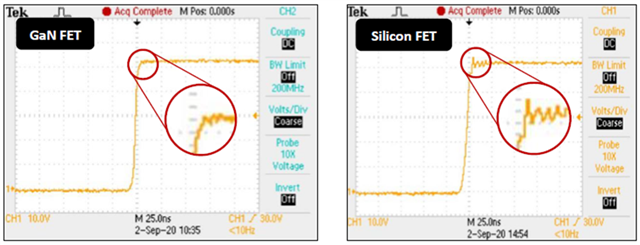 4. 開關(guān)波形比較:GaN FET波形(左)和Si FET波形(右)