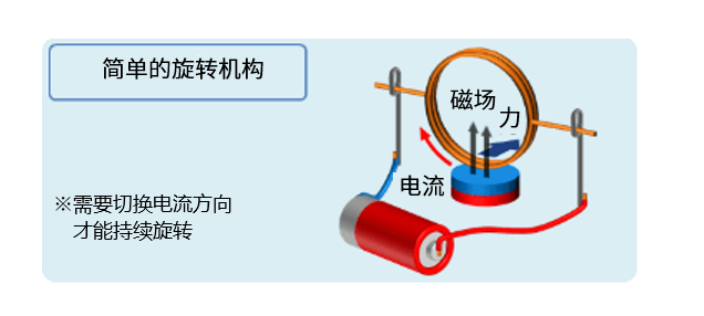 還有另外一種解釋思路,也許這種解釋更通用,也可以說(shuō)電機(jī)“利用了通電導(dǎo)體在磁場(chǎng)中的受力”。這就涉及到“弗萊明左手定則”。我們可以用下面的簡(jiǎn)單旋轉(zhuǎn)機(jī)構(gòu)示意圖來(lái)具體了解這個(gè)原理(注:需要切換電流方向才能持續(xù)旋轉(zhuǎn))。不過(guò)它的結(jié)構(gòu)與后續(xù)將要介紹的實(shí)際電機(jī)結(jié)構(gòu)略有不同,因此,在這里我先來(lái)大致講解一下“電磁體的應(yīng)用”。