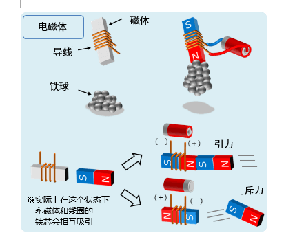 電磁體是在鐵等磁性材料上纏繞導(dǎo)線(xiàn)而制成的。當(dāng)然,只是這樣纏繞并不會(huì)發(fā)生什么,但是當(dāng)電流流過(guò)導(dǎo)線(xiàn)時(shí),磁性材料就會(huì)擁有磁鐵的特性,會(huì)吸引其他磁體(鐵等)。另外,由于可以通過(guò)改變電流的方向來(lái)改變磁極,因此如果在一個(gè)磁體的對(duì)面配置另一個(gè)磁體,那么施加在該磁體上的力就可以在引力和斥力之間切換(參見(jiàn)下圖)。