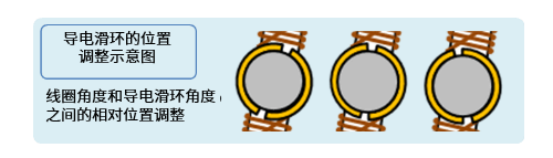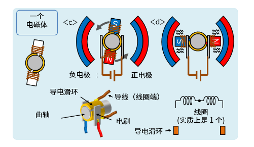 在“一個(gè)電磁體”圖中,有兩個(gè)電刷,一個(gè)接正電極,一個(gè)接負(fù)電極。如圖所示,當(dāng)用電刷夾住導(dǎo)電滑環(huán)時(shí),電壓會(huì)施加在與滑環(huán)相連的線(xiàn)圈上,從而使電流流過(guò)。該導(dǎo)電滑環(huán)安裝在電機(jī)的曲軸上,與線(xiàn)圈(電磁體)一起旋轉(zhuǎn)。