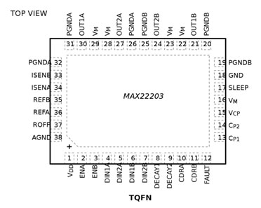 MAX22203具有過流保護(hù)(OCP)、熱關(guān)斷(TSD)和欠壓閉鎖(UVLO)功能。每次檢測到故障條件時(shí),都會(huì)激活一個(gè)開漏低電平有效nFAULT引腳。在熱關(guān)斷和欠壓鎖定期間,驅(qū)動(dòng)器為三態(tài),直到恢復(fù)正常工作為止。該期間采用小型TQFN38 5mm x 7mm封裝。