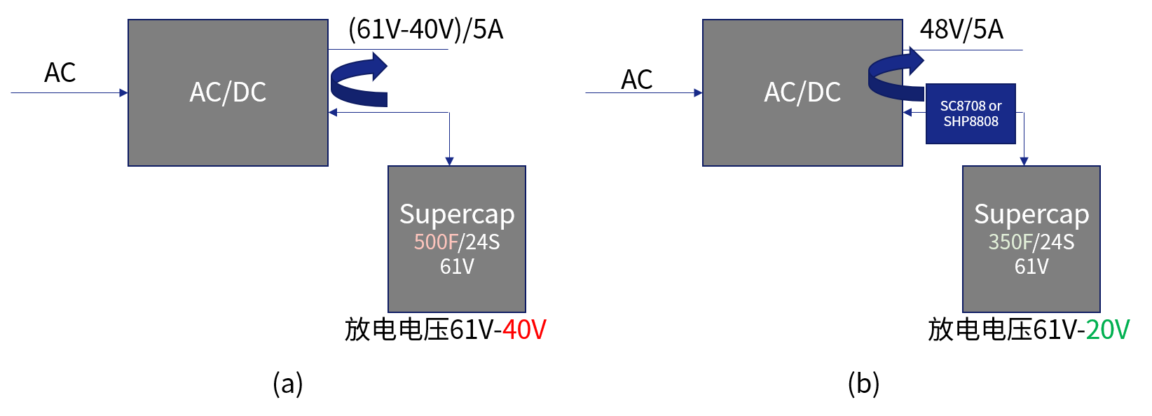 如下圖所示,傳統(tǒng)方案 DTU 備電模組的放電范圍僅 61V-40V,考慮到后級負(fù)載供電要求,需要采用 24 串單個電容為 500F 的超級電容模組,無法充分利用電容能量,造成系統(tǒng)浪費(fèi)。通過在電路中添加 SC8708 或 SHP8808,可以將放電深度轉(zhuǎn)換至 20V 以下,系統(tǒng)僅需 350F 的 24 串電容即可滿足后級負(fù)載要求,大幅降低整體 BOM 成本。使用 SHP8808 還能同時實(shí)現(xiàn)充電和放電。