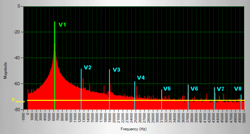 為了可視化 ADC 輸出中的諧波失真,我們將提供一個(gè)正弦波作為 ADC 的輸入,并繪制 ADC 數(shù)字輸出的傅里葉變換(又名 FFT)。圖 1 顯示了此類 ADC 輸出的 FFT 示例。理想情況下,F(xiàn)FT 應(yīng)在正弦波頻率處具有單個(gè)頻率尖峰。盡管輸入信號(hào)的頻率在 FFT 圖中具有幅度(FFT 中的綠色莖),但圖中還可以看到其他頻率內(nèi)容。輸入信號(hào)頻率稱為基頻。除了基頻分量之外,F(xiàn)FT 中還會(huì)周期性地出現(xiàn)尖峰(藍(lán)色莖)。這些是輸入信號(hào)頻率的諧波。
