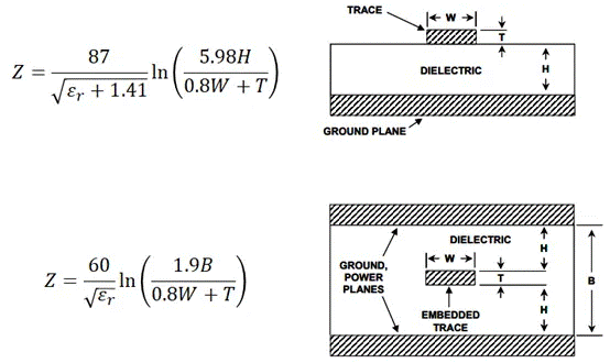 PCB 行業(yè)使用的最基礎(chǔ)阻抗模型是 IPC-2141 標(biāo)準(zhǔn)中的公式。下文所示的 IPC-2141 微帶線和帶狀線阻抗計算公式基于實驗觀察得出,在低于 1GHz 的頻率范圍內(nèi)具有較高的準(zhǔn)確性。
