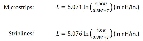 在上述特定配置中,走線電容是相對于最近的接地平面定義的。最后,我們得到兩個分別用于計算微帶線和帶狀線走線電感的公式。