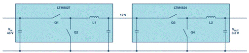 圖2. 電壓分兩步從48 V降至3.3 V,包括一個12 V中間電壓
