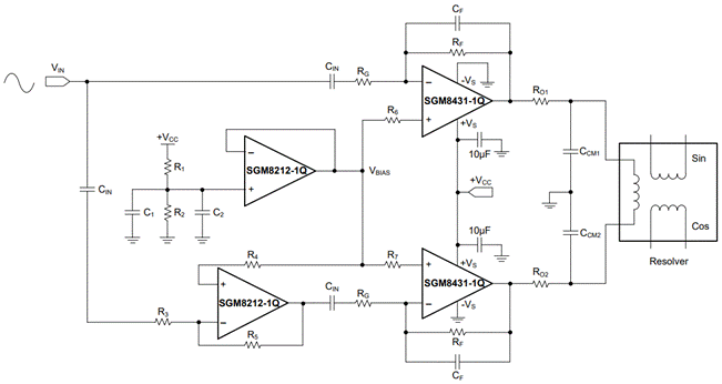 針對混合動力汽車和電動汽車中電機(jī)驅(qū)動器的旋轉(zhuǎn)變壓器勵磁需求,SGM8431-1Q 以其高電壓和高輸出電流的特性,特別適合于這些應(yīng)用。在這些應(yīng)用中,SGM8431-1Q 能夠有效替代傳統(tǒng)的由運(yùn)算放大器和功率晶體管組成的復(fù)雜旋轉(zhuǎn)變壓器勵磁驅(qū)動器,簡化系統(tǒng)設(shè)計。