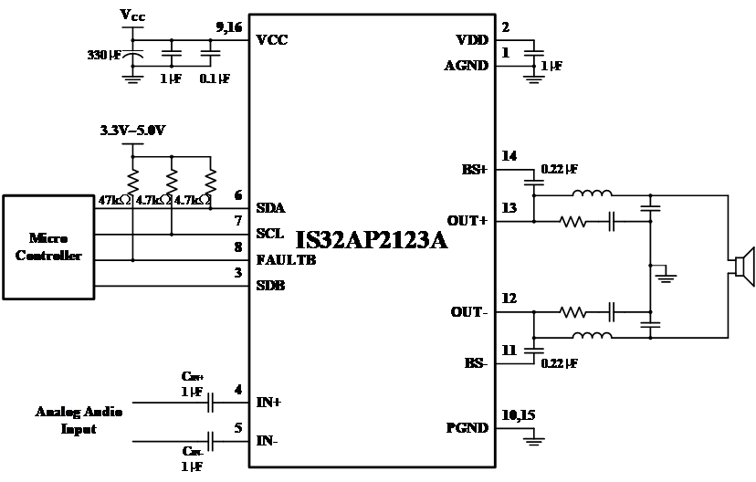 面對日益復(fù)雜的車載系統(tǒng)需求,絡(luò)明芯推出了一款符合AEC-Q100車規(guī)認(rèn)證的高性能、高可靠性、低功耗、大功率的單聲道D類音頻功放芯片IS32AP2123A。該芯片高達(dá)24W輸出功率,高信噪比,完善的故障檢測機(jī)制,以及創(chuàng)新的基于自動增益控制(AGC)的輸出功率限制功能,不僅能保護(hù)揚聲器,又能保證輸出音量和音質(zhì),非常適合AVAS應(yīng)用。IS32AP2123A典型應(yīng)用電路如圖2。