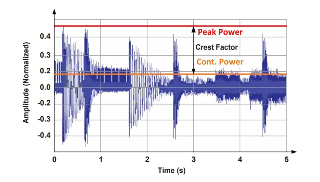 首先需要明確兩個術(shù)語:峰值功率和連續(xù)功率。峰值功率是最大瞬時音頻功率。它將決定電源可實際輸出的功率大小。連續(xù)功率是指一段時間內(nèi)的平均音頻功率。在電源設(shè)計中,連續(xù)功率是指系統(tǒng)在不超過元件溫度或平均電流額定值的情況下可以提供的特定輸出功率。圖 1 提供了峰值和連續(xù)音頻級別的示例。它們與波峰因數(shù)(波形的峰值與均方根 (RMS) 值之比的度量)有關(guān)。