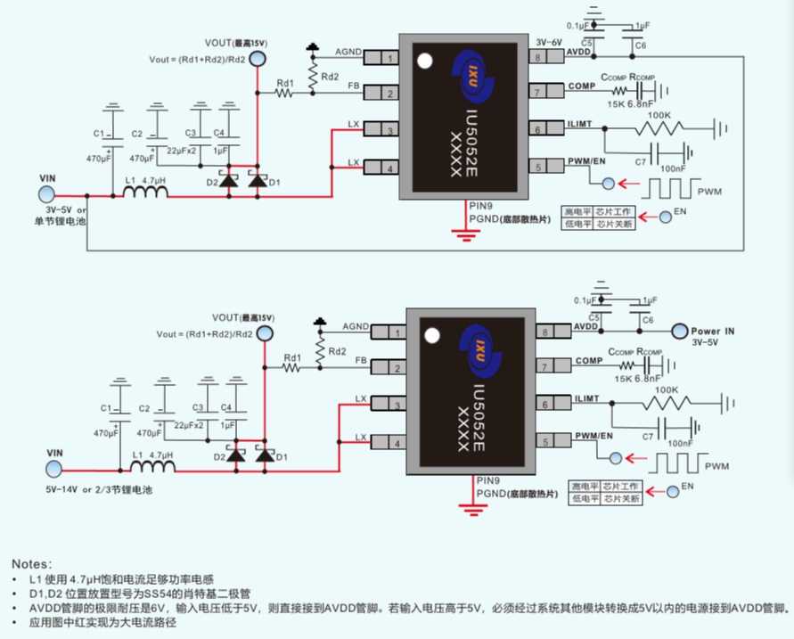 IU5052E最高可提供15V恒定的電壓輸出;最大可保證14A的電感電流下負(fù)載穩(wěn)定工作.低至3V的啟動(dòng)電壓,3~14V的寬工作電壓范圍,可最大限度的適用于各種終端設(shè)備。