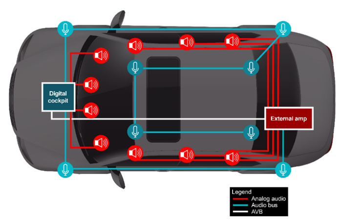 過去,高端汽車音響系統(tǒng)中的數(shù)字放大器采用分布式架構(gòu)進(jìn)行音頻處理,由單獨(dú)的 MCU、數(shù)字信號(hào)處理器 (DSP) 和網(wǎng)絡(luò)集成電路 (IC) 處理不同的任務(wù)。雖然這種分立式方法通常提供了設(shè)計(jì)靈活性,但也增加了系統(tǒng)復(fù)雜性、成本和尺寸。為了增加沉浸式環(huán)繞聲和道路噪聲消除 (RNC) 以提供家庭影院般的體驗(yàn),同時(shí)優(yōu)化燃油和能源效率,需要增加元件、音頻通道和軟件類型的數(shù)量。圖 1 展示了現(xiàn)代車輛中的音響系統(tǒng)示例,其中包含用于環(huán)繞聲的多個(gè)揚(yáng)聲器和用于 RNC 的麥克風(fēng)。