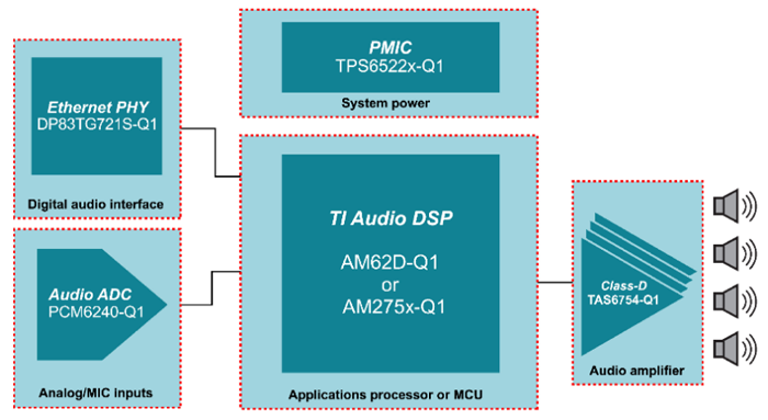嵌入式處理器更高的器件集成度有助于簡(jiǎn)化音響系統(tǒng)設(shè)計(jì)。例如,AM62D-Q1 處理器和 AM275x-Q1 MCU 高度集成的汽車級(jí) SoC 采用 TI 的 C7x DSP 內(nèi)核、存儲(chǔ)器和元件,旨在幫助您通過單個(gè)器件滿足外部功能安全要求、信息安全要求和音頻網(wǎng)絡(luò)要求。