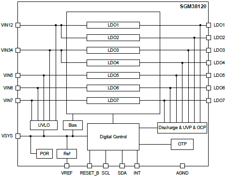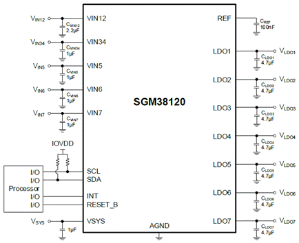 SGM38120 是一款高性能的 7 通道低壓差線性穩(wěn)壓器(LDO)電源管理集成電路(PMIC),集成了兩種類型的 LDO 通道:兩個(gè)低壓差 N 溝道 MOSFET LDO 通道和五個(gè)高電源噪聲抑制比(PSRR)及低噪聲 P 溝道 MOSFET LDO 通道。這種設(shè)計(jì)使其能夠滿足多種電源管理需求,同時(shí)兼顧高效性和穩(wěn)定性。