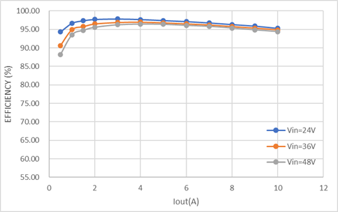 從熱成像圖可以看出,DEMO板在高負(fù)載條件下,溫度分布均勻,沒有局部過熱現(xiàn)象。在VIN = 24V, VOUT = 12V, IOUT = 10A 的條件下,最高溫度點(diǎn)為82.2℃,在 VIN = 48V, VOUT = 12V, IOUT = 10A 的條件下,最高溫度點(diǎn)為97.3℃