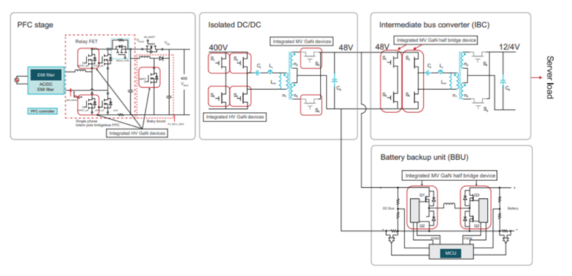 針對(duì)中壓GaN,服務(wù)器電源應(yīng)用中的三個(gè)主要系統(tǒng)可以采用 100V 至 200V 的 GaN: